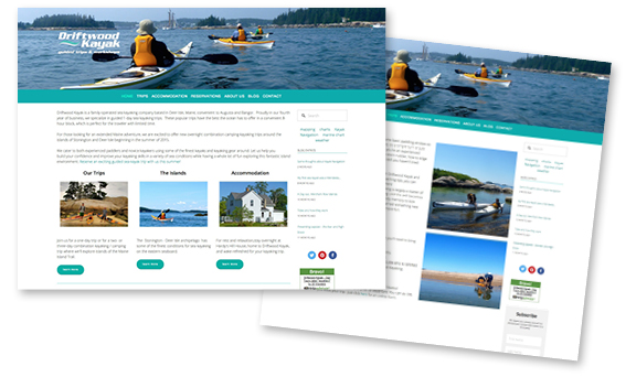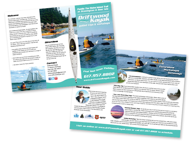 Driftwood Kayak is a family run operation that leads guided tours and workshops on the Main Island Trail in Stonington and Deer Isle, Maine. The owner wanted to revamp his tired old website, integrate SEO and also overhaul his marketing strategies. We started with a redesign of the logo, and I proceeded to consult him on creating a friendly user interface and trained him on how to create pages and edits within his site. With my support he is capable of working on his own website and blogging. We continued working together to create marketing materials including ads, car magnets, signage and brochure and have increased his SEO 3-fold.