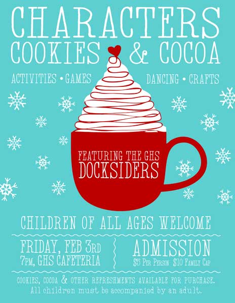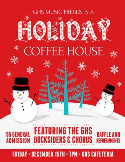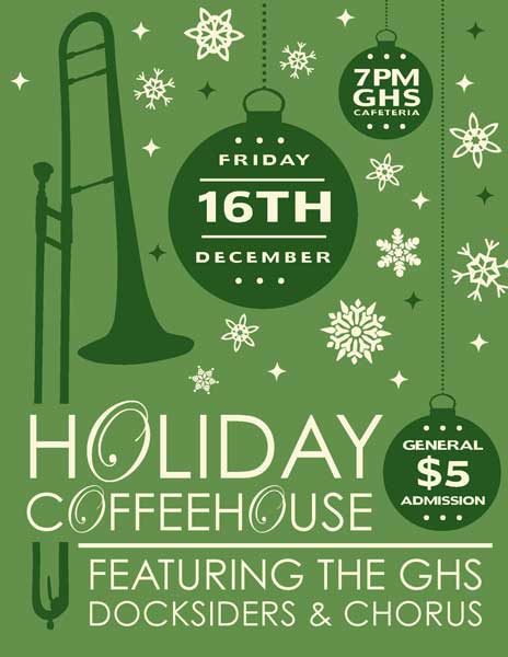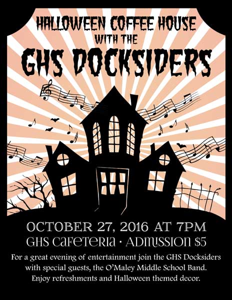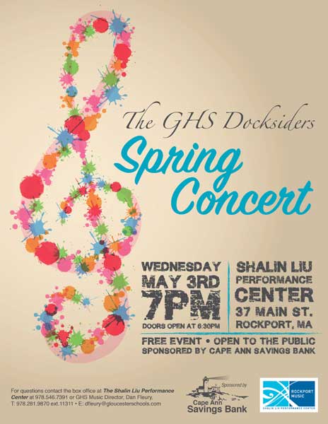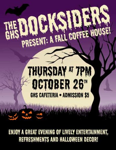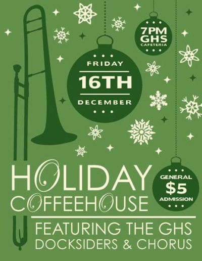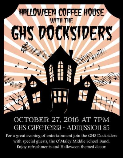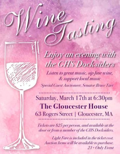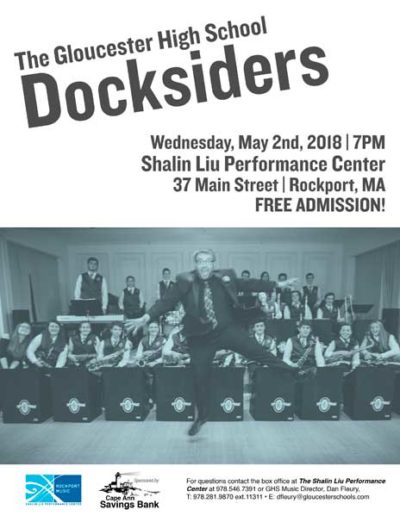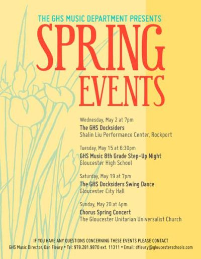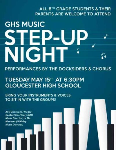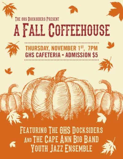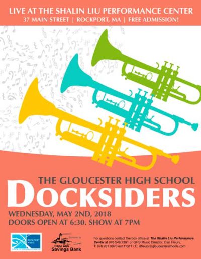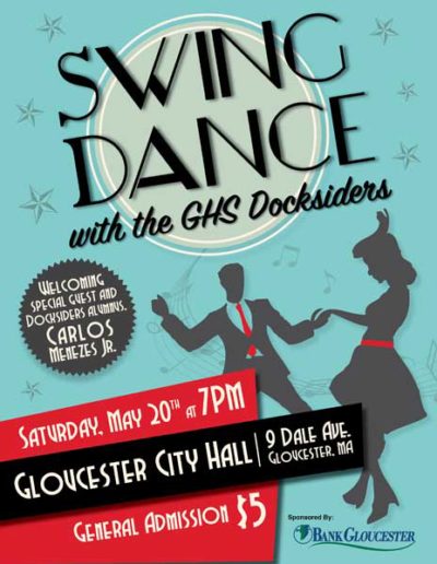 The Gloucester High School Docksiders is a jazz band made up of local Gloucester students. They perform regularly around the city during events like the Arts Festival, block parties, sidewalk bazar and parades as well as their own coffeehouses and annual wine tasting. They are welcomed back annually to play at the Topsfield Fair and also perform a spring concert at the Shalin-Liu Performance Center in Rockport. A particular talented trombonist I know is in the band (my daughter), and I volunteer my time to create interesting and fun posters, postcards, tickets and flyers for their events and social media outlets.